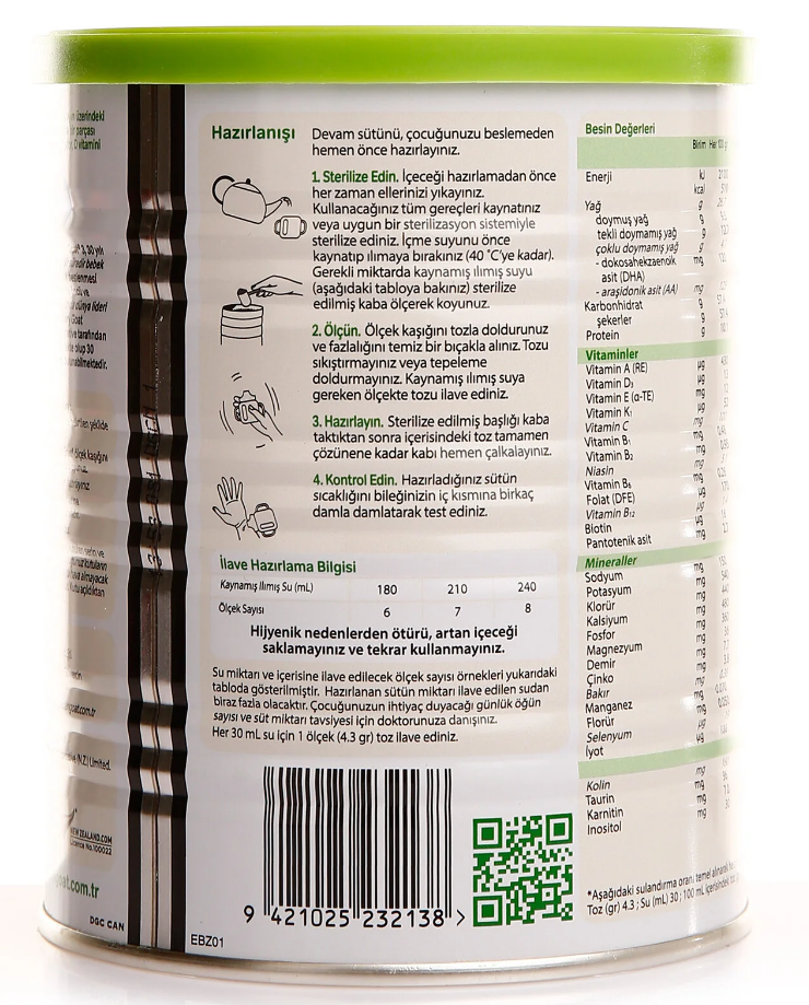 - Folik asit ve Demir gibi bebekler için gerekli diğer vitamin ve minerallerle formülü takviye edilmiştir.