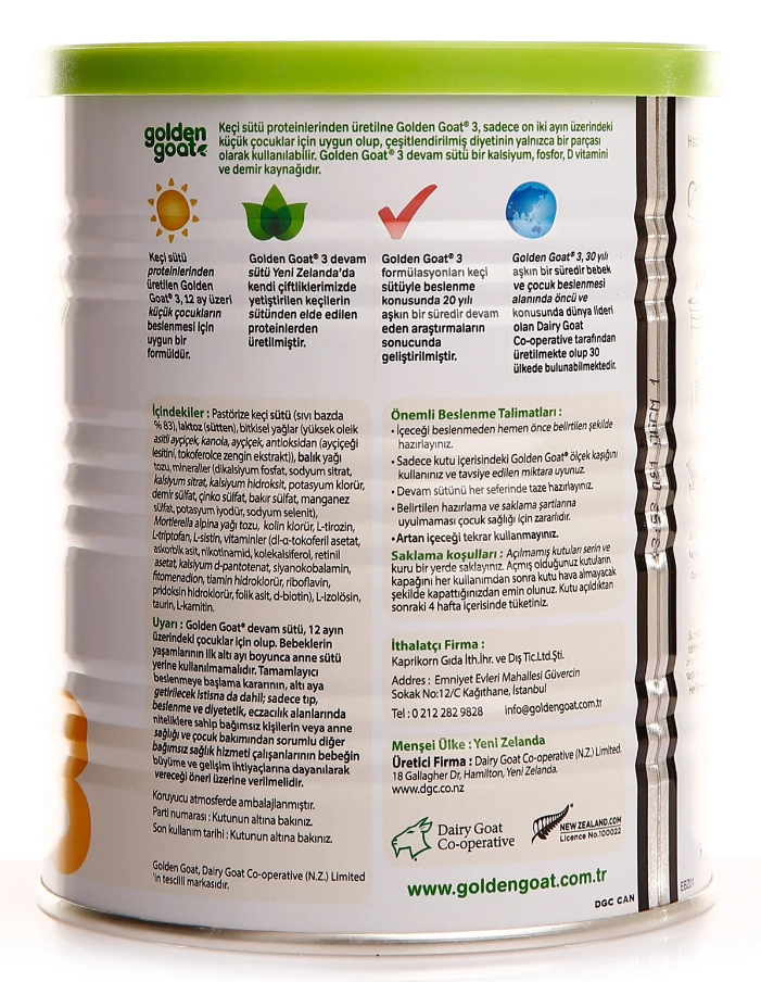 - Golden Goat® Yeni Zelanda’da DGC (NZ) Ltd. tarafından kendi çiftliklerinde yetiştirilen keçilerin sütlerinden üretilir.